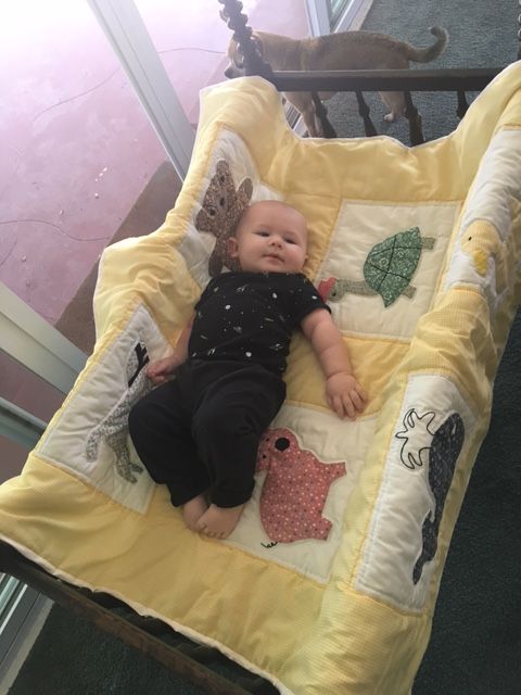 3 March 2017. Star's little first cousin, Landon Patrick Mansfield, visits us and tries on the cradle for size. Here he is, lying on a quilt which was made by his great-great-grandma Jeanette (Walker) Carey: