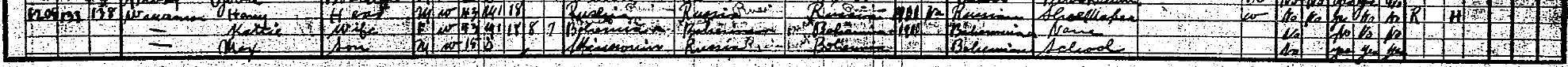 The Wassermans' 1910 census record provides a clue as to just where in Russia Henry might have come from. Below are three lines, which appear to be for Harry and Kattie and son Max. While the information isn't especially legible, I believe I can make out Pinsk, written very faintly in the same space where we see Russia for Henry's birthplace. Something is written along with Bohemia on Katharina's line, but I'm not sure what. In the space for her mother's birthplace, I think I can make out Czech, in addition to Bohemia. There wasn't any Czechoslovakia, or Czech Republic, though, in 1910, so this notation must have been added at least eight years later. And of course, there is no Bohemian language, as she and Max are both credited with speaking...